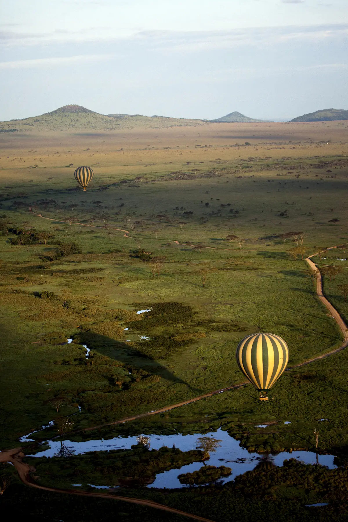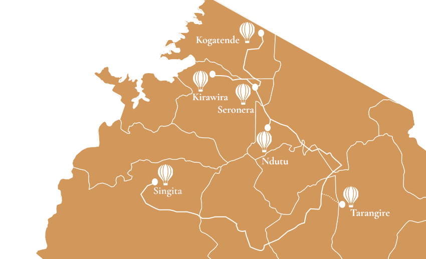 Rise before sunrise and lift gently into the quiet sky as the savannah wakes below. From the basket, you watch rivers glimmer, acacias cast long shadows, and herds ripple like silk across golden grass while morning light softens everything.